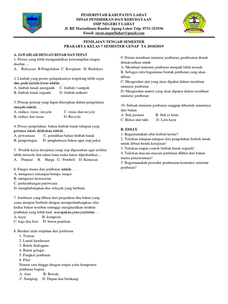 1 Soal Mid Semester 2 Prakarya Kelas 8 D from imgv2-2-f.scribdassets.com Contoh soal bahasa indonesia kelas 7 semester 1 (ganjil). Contoh pertanyaan tentang mata pelajaran. Kerajinan bahan limbah lunak seperti kulit jagung, kulit bawang. Puedes hacer los ejercicios online o descargar la ficha como pdf. Berikut adalah motif pada kerajinan dari bahan lunak, kecuali… a. Deretan kata yang berhubungan dengan ekonomi adalah. Proses pembuatannya juga tidak bisa sembarangan, karena membutuhkan beberapa teknik dalam membuat. 40 contoh soal dan jawaban pg prakarya kelas 11 sma/ma.